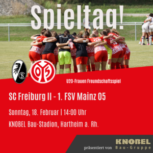 Wir freuen uns, erneut die Frauen des SC Freiburg II im KNOBEL Bau-Stadion begrüßen zu dürfen. Die Freiburgerinnen rund um das Trainerteam Amin Jungkeit (Cheftrainer) und Daniel Braun (Torwarttrainer) – beide inzwischen Wahl-Hartheimer – treffen am 18. Februar 2024 auf die Frauen des 1. FSV Mainz 05. Anstoss ist um 14 Uhr!